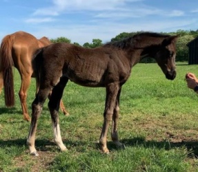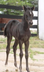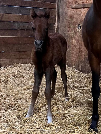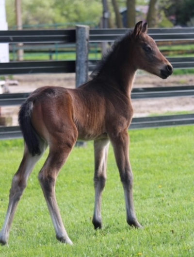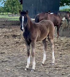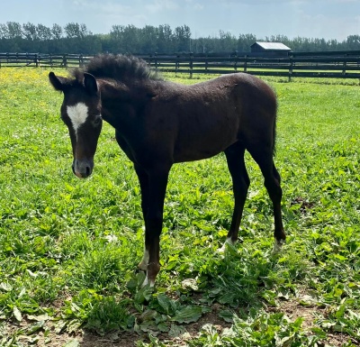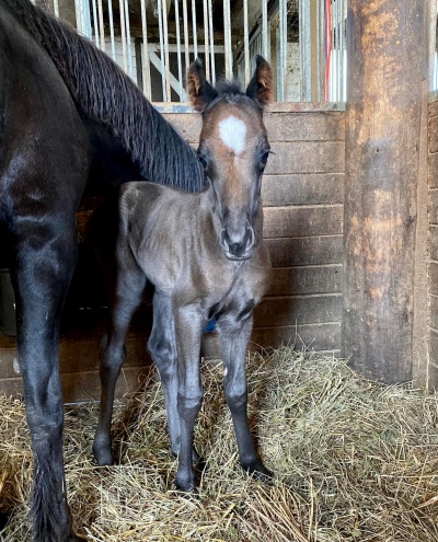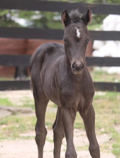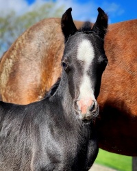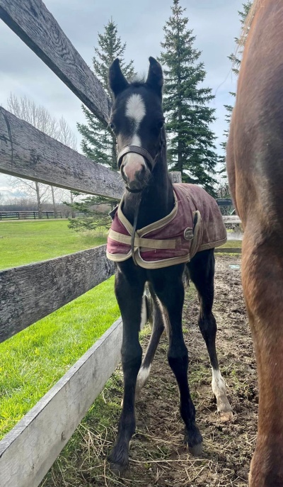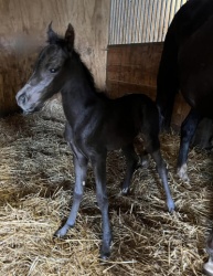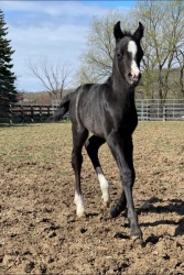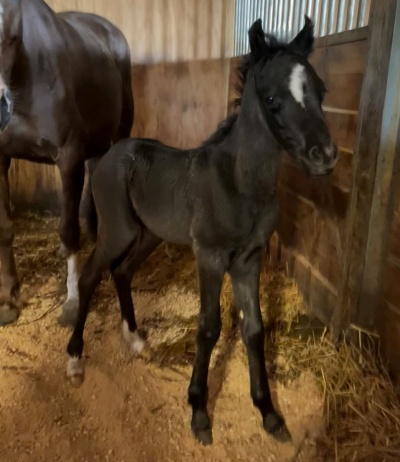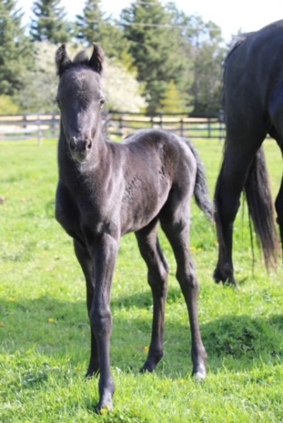 We are excited to announce the arrival of our first foal of 2023! A gorgeous, black colt sired by Hillcrest's Top Hat and out of our homebred mare Crown Ridge Millie Milia (by *Downland Whimsical). We look forward to watching this colt mature.